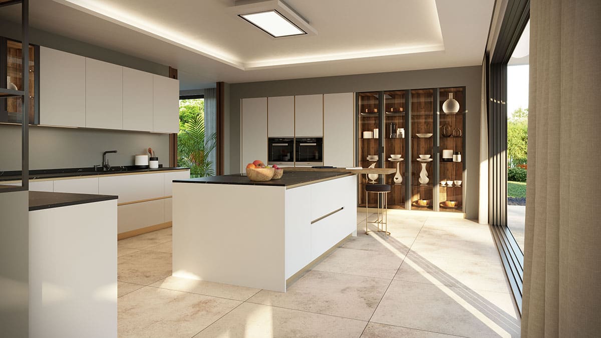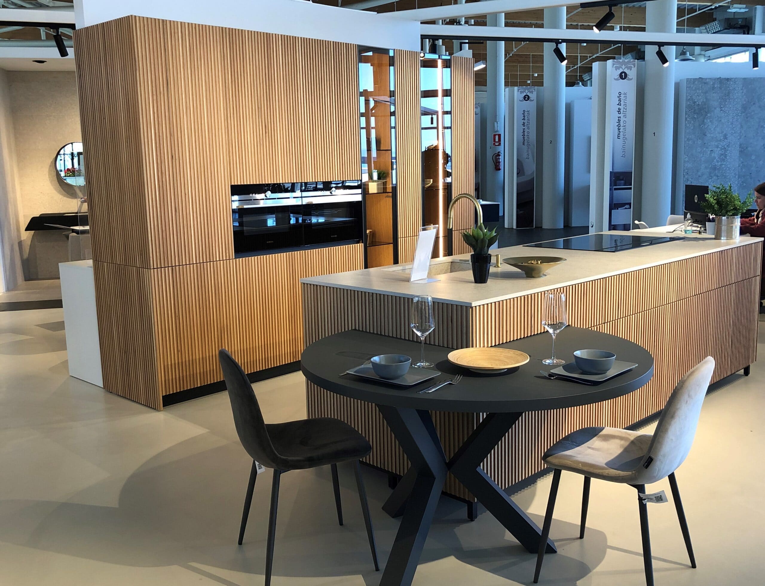 Tendencia clara: paletas cálidas y naturales que dialogan con suelos, encimeras y revestimientos; mates sedosos que no saturan visualmente; maderas tostadas o eucalipto ahumado; y neutros piedra. Esta línea estética, muy presente en nuestros proyectos y catálogos, ayuda a crear cocinas serenas y actuales.