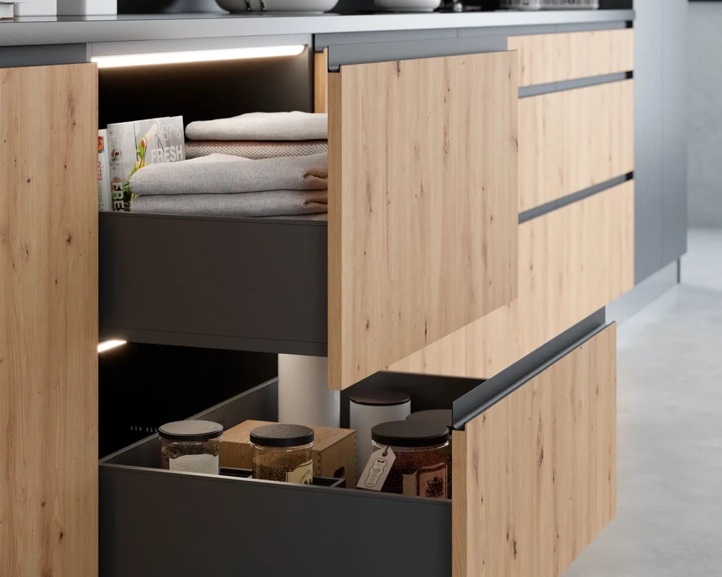 Apuesta por bisagras y guías de calidad, regulación precisa y cierres amortiguados: mejoran el tacto al uso y alargan la vida del mueble.